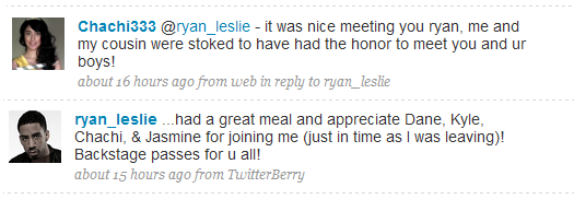 I arrive in San Francisco 11:37 pm to meet a very important man. My cousin and I are huge fans of this inspirational multi-talented super producer... I mean who else could it be... It's none other than the talented Ryan Leslie! So as we walk up to Scala's in downtown San Francisco, we approach the door and a high spirited - all smiles - mister Leslie walks out with a party of four; two of his best buddies and two other fans who came to see him as well. I said "Ryan," and he replies, "You came!" almost as if he'd been expecting us, he's just so adorable. I meet his crew, his cameraman, and gave him a great big hug, well maybe like 3. We talked for a while outside under the big city buildings and bright city lights. He is really an artist to the people. Better said, he is "The People's Artist," I just adore him for that. And I am sure in the short weeks to come with the release of his album he will just become greater! We are all very excited for Ryan, my cousin and I will be the first to buy Ryan's album on the 10th on itunes! Please make sure you check out RyanLeslieTV or RyanLeslie.com and be a part of his movement. Also don't forget to buy his album February 10th - just in time for valentines day, It would make a great gift for someone special!
